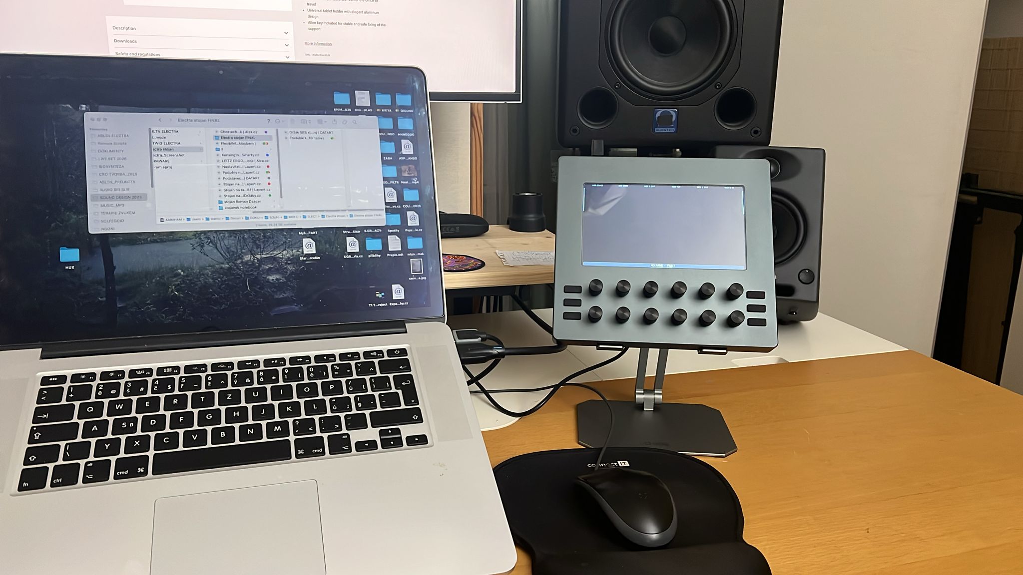 I have been using a 12 South Compass iPad stand. Bought it cheaply years ago, I guess the new ones are more expensive, but you can find cheaper refurbished ones online. Very sturdy, stable and portable (folds up). You can have the Electra stand up for programming next to your computer, or for “performance” it can lay down at a perfect low angle, but with enough clearance you can slip your laptop underneath it.