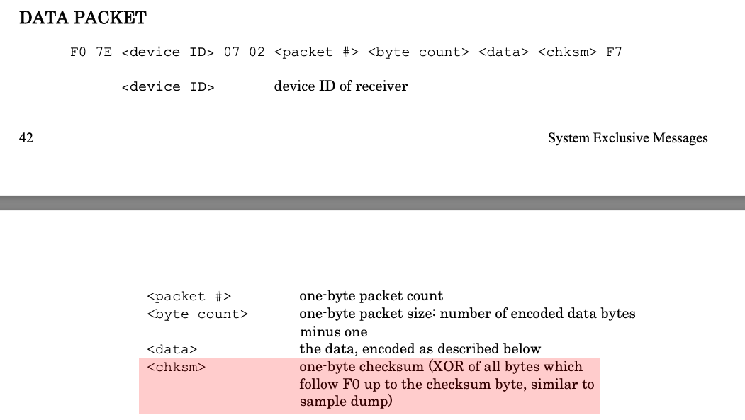 Looking at the dump, I noticed that each packet is a separate sysex transmission. So they’re a lot of 0xF0 … 0xF7 blocks. That was throwing me off at first. No idea how the E1 will handle all these separate packets since each one has the same header. Code will be needed to deal with that I would think.