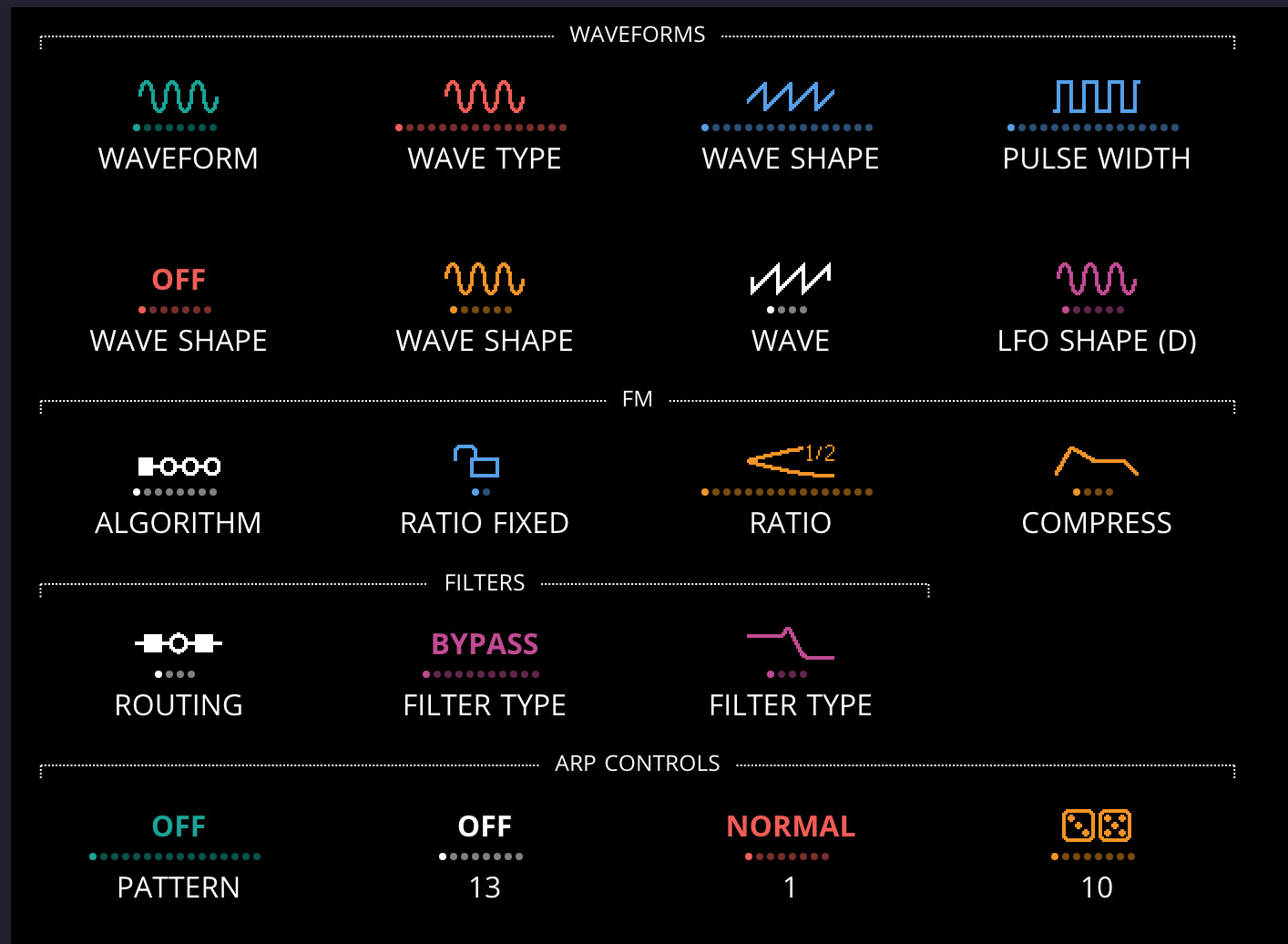 Some of them are very specific to those synths, but others are fairly universal, like sine, triangle, square and saw waves, or filter types like low pass, high pass, band pass, notch and comb.